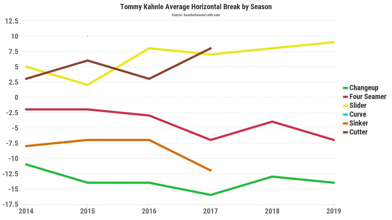 There’s a little more movement on the changeup and a little less movement on the fastball but nothing overly drastic in there. What is interesting is Kahnle’s release point over time. Here is his horizontal release point for the past 3 seasons:
