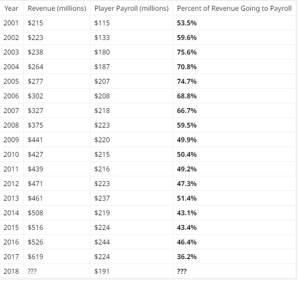 Even if the actual amount spent on payroll has remained the same, relative to rising revenues, the proportion spent on players has been steadily decreasing. Even if we assume that revenue did not increase last year (which makes no sense because revenues are at an all-time high), the 2018 Yankees spent under 31% of their revenue on payroll. That number placed them last in baseball. That’s right, by this metric, the Yankees spend less on their team than anyone else.