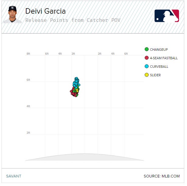 After Garcia’s first start, we and other outlets pointed out that Deivi does not have a consistent release point. Specifically, he releases his curveball about 6” higher than he does on his fastball. At the time, I pointed out this was worth monitoring to see if batters start to pick up on it. And that’s another explanation for why Deivi has been unsuccessful with the curveball and why he’s not getting any whiffs on it.