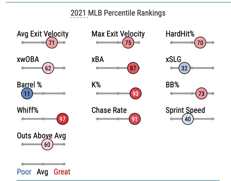 Oddly enough, his barrel rate of 2.9 percent was in the bottom nine percent of the league in 2020. This year he is up to 3.6 percent, but it’s still a far cry from the 7.5 percent clip he put up in 2019. So with the decrease in the amount of balls he hits hard comes the decrease in expected batting average. In fact, all of his expected stats are down: