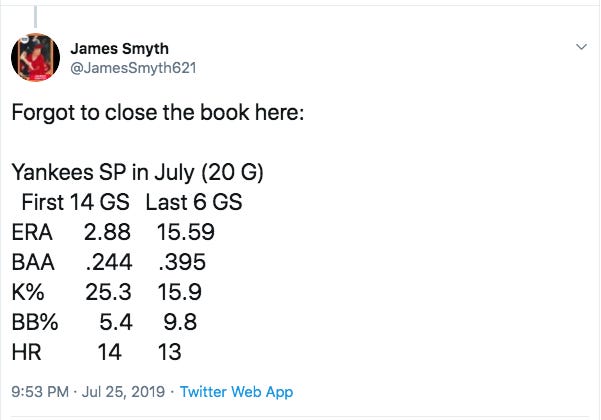 Before this historic blow-up, believe it or not, the starting pitching for the Yankees was one of the top-end rotations in the league in the month of July. According to YES Network's Booth Statistician, James Smyth, they were 10th in MLB in ERA, posting a 2.88 ERA, .244 BAA, and 14 home runs allowed in the first fourteen games of this month. So Cashman had some leverage, mainly, not seeming desperate.
