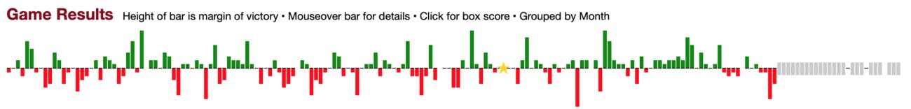 It seems as if most of the green bars are very small, indicating a close win, while there is no shortage of large red bars. And this just illustrates how streaky this team has been. The scary thing is that this may not just be a 2021 issue — if changes are not made, from the players to the coaches, this could carrying over to next year and beyond. Heck, this was even evident last season.