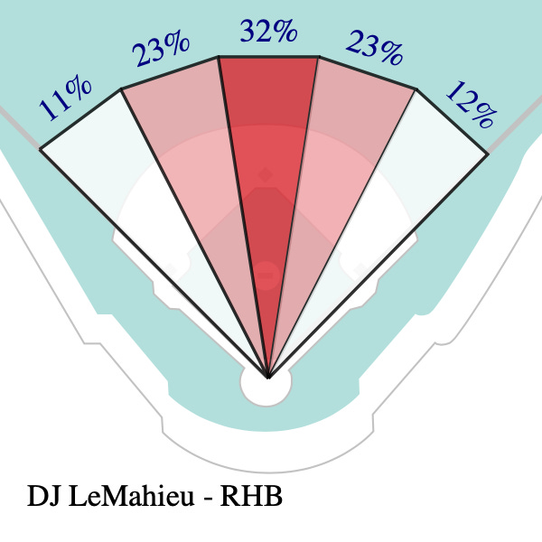 This shows that there are no periods of time when he goes into a prolonged slump. Furthermore, he produces in high leverage situations, having hit .303 in them throughout his career with an above-average 16.1 percent strikeout rate and 8.2 percent walk rate. He also uses the whole field as evidenced by the below spray chart that tracks batted balls with a projected distances of 200 feet or less.