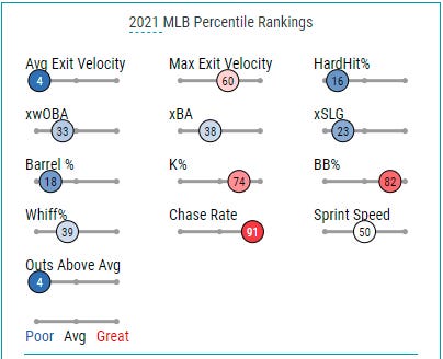 To start with, few of them have hit much at all in 2021. Gio Urshela is the only player who has lived up to the back of his baseball card, slashing .287/.342/.455. His 125 wRC+ is on par with his 132 wRC+ from 2019-2020. D.J. LeMahieu's .282/.373/.395 line is a big step down from his MVP-finalist 2020, but given the short season last year and the decreased offense throughout MLB this year, it's probably a more accurate reflection of his true talent level.