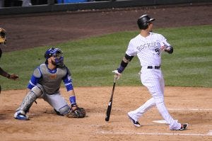 DENVER, CO - JUNE 28: Carlos Gonzalez #5 of the Colorado Rockies hits a three run home run in the fourth inning against the Toronto Blue Jays at Coors Field on June 28, 2016 in Denver, Colorado. The Toronto Blue Jays defeat the Colorado Rockies 14-9. (Photo by Bart Young/Getty Images)