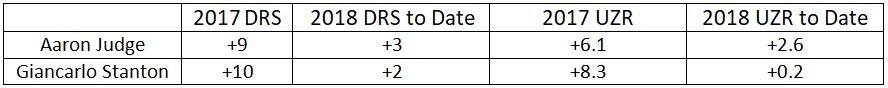 However, let’s not forget Giancarlo Stanton. He’s also extremely athletic and is no slouch in the field either. Stanton has played a little RF this season with the Yankees, so his numbers are listed below as well.