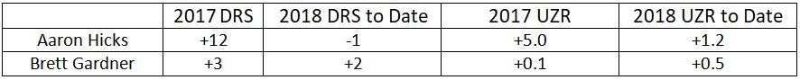 I remember when the Yankees traded for Aaron Hicks, I was upset. I was a big John Ryan Murphy fan at the time, and Hicks hadn’t really shown enough at the MLB level to be an everyday guy on a top tier team. Boy was I wrong. Hicks brought his stellar defensive reputation over to the Yankees and has shined in center field the last few seasons. Here are his numbers below, along with Brett Gardner, who can still fill in at CF admirably.