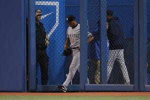 The Yankees wouldn't get another baserunner until the seventh inning when Eduardo Nunez got a single. J.A. Happ shut down the Yankees through the first seven innings. Brendan Ryan would open the eighth inning with a ground-rule double and that would be the last batter for Happ, left-handed reliever Aaron Loup would take over and it didn't go well for the Jays.