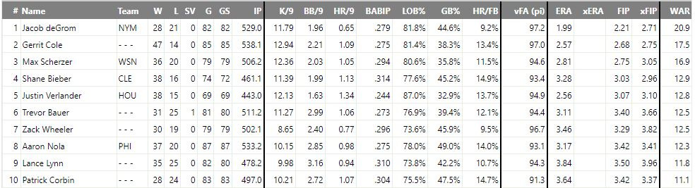 Mad Max will turn 37 this July, and while that’s a ripe pitching age, he is still elite. So far this season he has a 11.85 K/9, 1.36 BB/9, and owns a 2.33 ERA. His average fastball velocity hasn’t really fallen off yet either. This year it stands at 94mph, and his career average is 94.3mph. Age will catch up to him eventually, but since he would only be a summer rental, the Yankees wouldn’t need to worry about father time here. Below is the starting pitcher WAR leaderboard since 2018. Yeah, gimmie.
