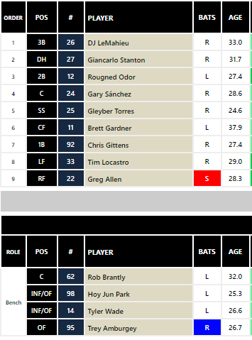 That leaves the two trade acquisitions: Rougned Odor and Tim Locastro. Ten years ago, the Yankees' #3 hitter was Robinson Canó in his prime. 60 years ago, Roger Maris' hit 61 home runs from the third spot in the lineup. 100 years ago, Babe Ruth led them to their first World Series from the three-hole with a .512 OBP and 59 home runs. Now it's Odor, a player cut by the moribund Texas Rangers. Locastro has been a great story with a gruesome ending. His torn ACL necessitates yet another roster move before today's game.