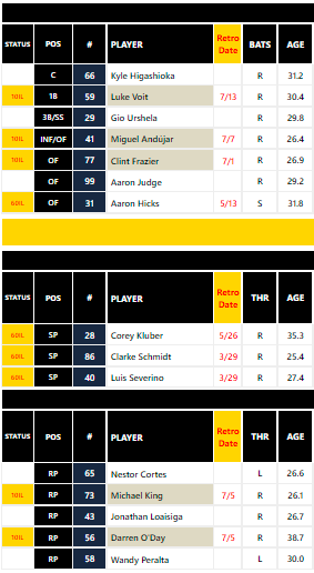 Sometimes, roster fluidity causes bizarre circumstances. Such is the case when seven players landed on the IL immediately following the All-Star break— six due to COVID and one Luke Voit because of more knee trouble. Here are some screenshots of Roster Resource's Yankee page on Sunday morning (by the way, it's a great site worth bookmarking). It will undoubtedly have changed by the time this article publishes because that's how rosters work. Sometimes all you can do is laugh (so you don't cry), and this is one of those moments.
