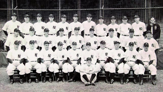 Casey Stengel's club set an MLB record with their fifth consecutive World Series victory. The Bronx Bombers finished 99-52. Catcher Yogi Berra belted 27 home runs and finished second in AL MVP voting. Centerfielder Mickey Mantle posted a 145 OPS+ and a rightfielder Hank Bauer sported a 131 OPS+. Pitcher Eddie Lopat led the AL with a 2.42 ERA, Whitey Ford and Johnny Sain sported 3.00 ERA's. New York topped Brooklyn in the World Series, 4-2. Billy Martin batted .500, Berra hit .429. and Lopat pitched a complete game in the Fall Classic.