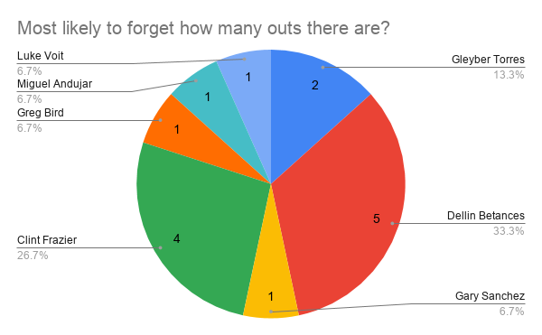 Yes, I’ll admit it: this one was a gimme for Jacoby Ellsbury to “win” something (but he did have a strong opponent in Greg Bird). I am curious as to how people think they would get injured. Maybe during an appearance on Dancing with the Stars? Giancarlo Stanton’s injury-riddled 2019 makes him an appropriate answer (injury by flexing too hard), while Tommy Kahnle’s unpredictable energy also makes him a prime target of the strange injury bug (keep him away from the sunflower seed container).