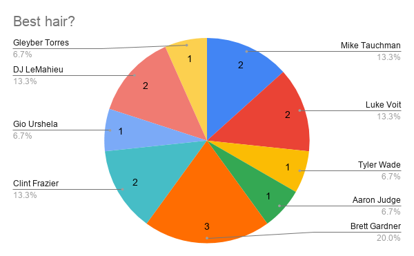 To be honest, when I thought of this question no one’s hair immediately stood out to me. There were many differing opinions among the BP Team with nine different players getting votes. But are we at all surprised that Brett Gardner’s beautiful chrome dome took the cake?