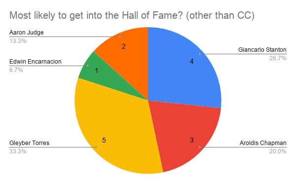 CC is an obvious candidate here, which is why I asked to exclude him from consideration. I was a little surprised by Giancarlo coming in second, but if he can stay healthy he has the ability. But the baby of the squad has had a historic start to his career: he joined legends Mickey Mantle and Joe DiMaggio as the only Yankees to make multiple All-Star teams before turning 23. Did you know Gleyber is only 22?