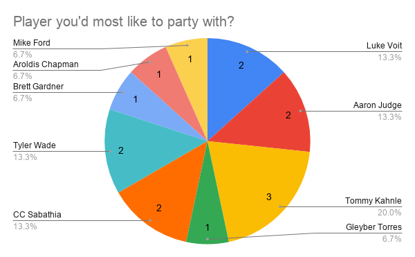 Another question that got mixed results. As just said, Tommy Kahnle surely is up for anything. Tyler Wade is probably your stereotypical frat guy. Meanwhile, I feel like Judge and CC would be on the calmer side, but you know you’re going to have a good time.