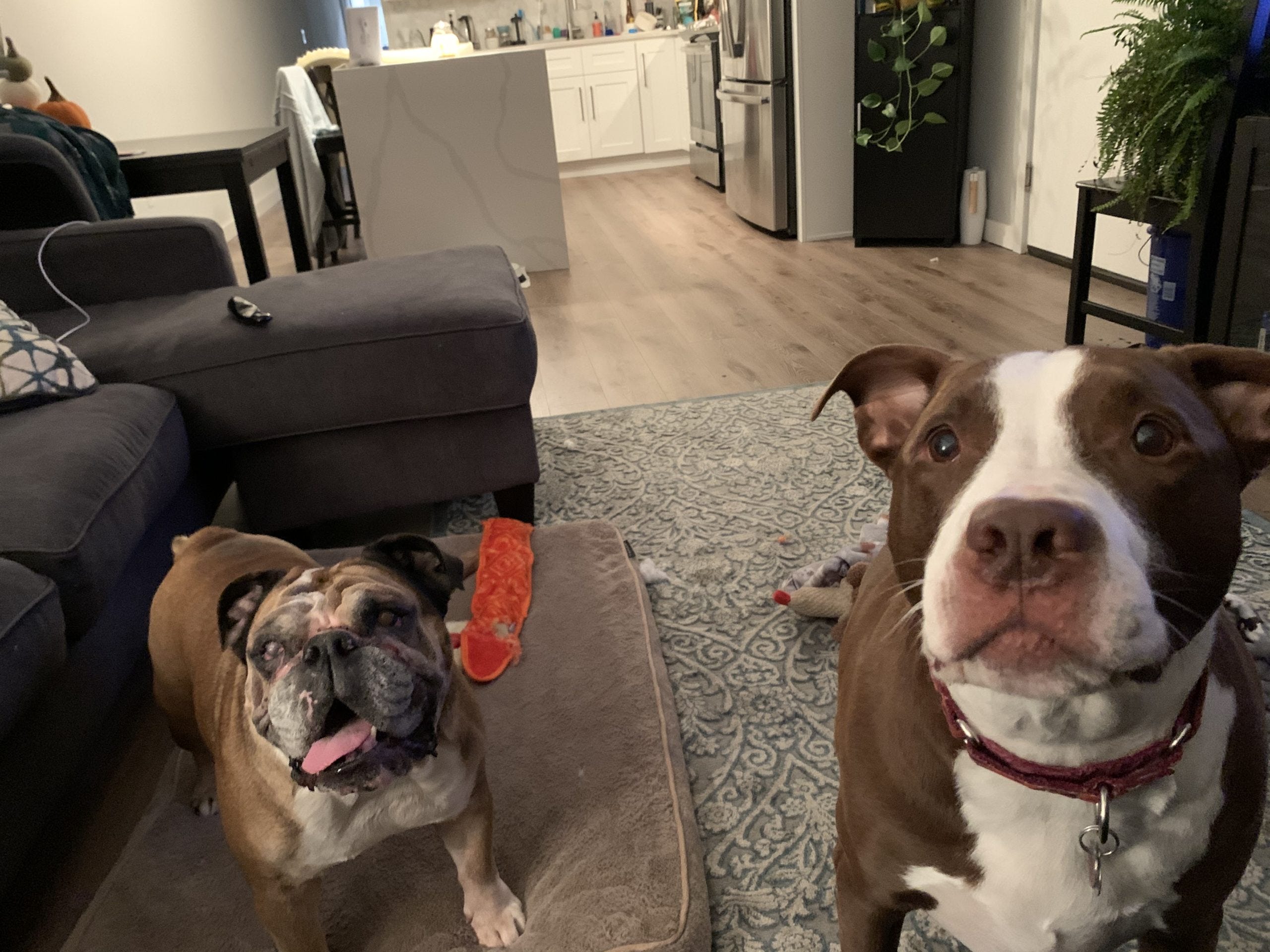 Gertie is the bulldog on the left while Tyson is the handsome gentleman on the right!