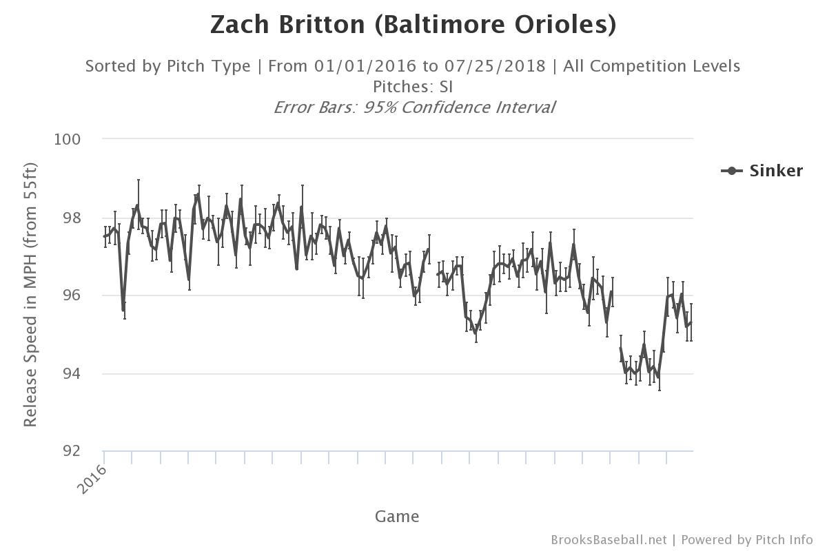 Britton had an Achilles injury earlier this season, so his first appearance didn’t come until June 12th. His inflated 3.45 ERA (for his standards) is mostly due to one blow up outing on June 22nd. Out of his 15 other appearances, he had only given up an earned run in one of them. It took Britton a little while after his injury to look like “himself.” The below graph illustrates this. His velocity has been trending in the right direction since July 1st.
